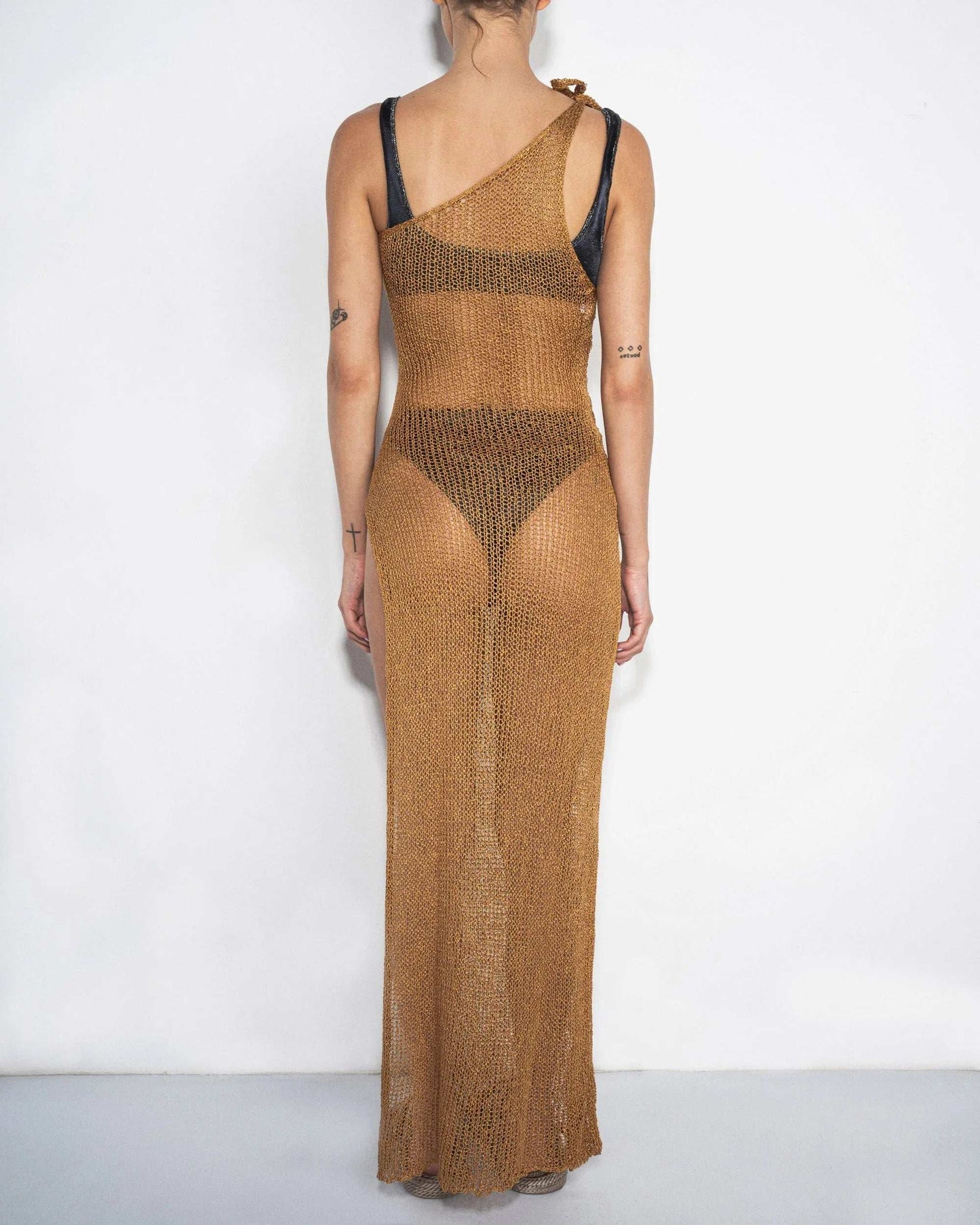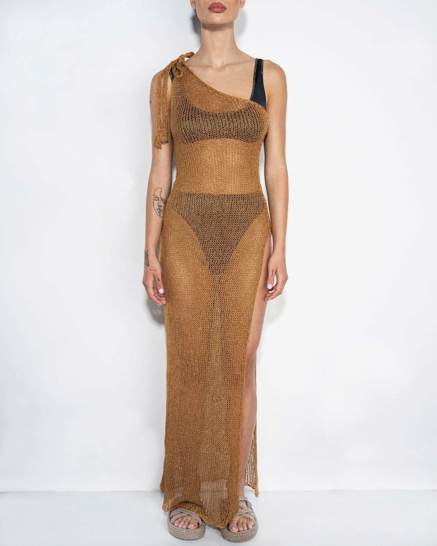 Тази рокля е майсторски изработена в България с едно рамо и висока странична цепка, която визуално издължава фигурата. Отворената плетка създава ефирен ефект, което прави роклята перфектна за плажа над любимия бански Amuseа.